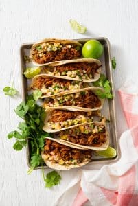 Tacos au porc effiloché et salsa à l’ananas Pour 4 personnes Ingrédients: Pour la salsa à l’ananas 1 tasse (250 ml) d’ananas en petits dés ¼ tasse (60 ml) de coriandre hachée finement ¼ tasse (60 ml) d’oignon rouge émincé ½ jalapeño, épépiné, haché finement 2 c. à...